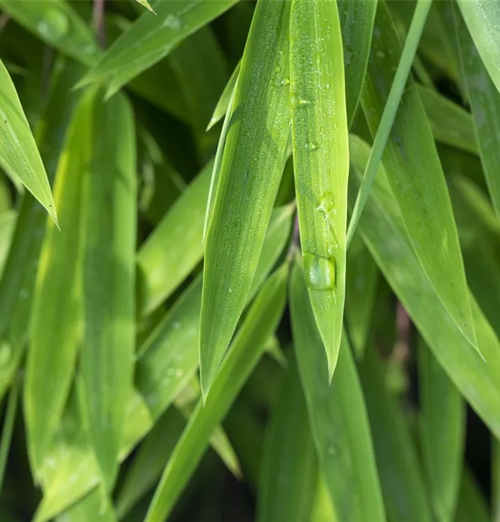 Die immergrünen Blätter des Bambuses 'Black Pearl' sind dunkelgrün, lanzettlich.