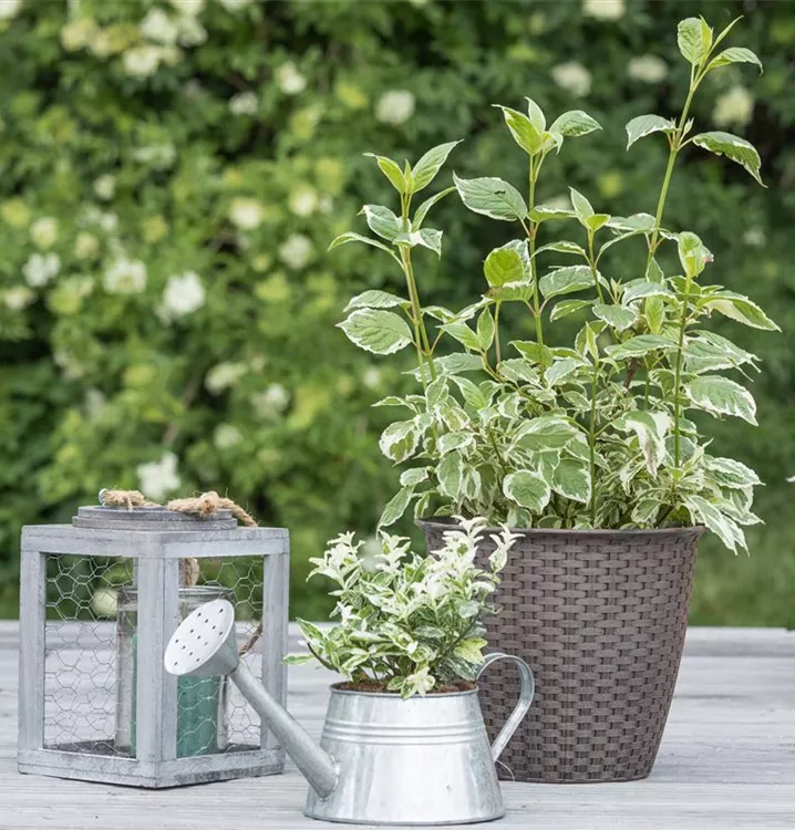 Die weißen Blüten des Hartriegel 'Sibirica Variegata' erscheinen in Trugdolden von Mai bis Juni.