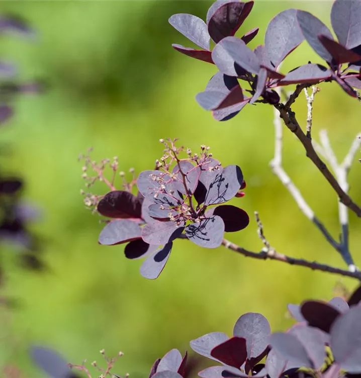 Die rot-braunen Blüten des Roten Perückenstrauch 'Royal Purple' erscheinen in Rispen von Juni bis Juli. Diese werden etwa 15 - 20 cm groß.