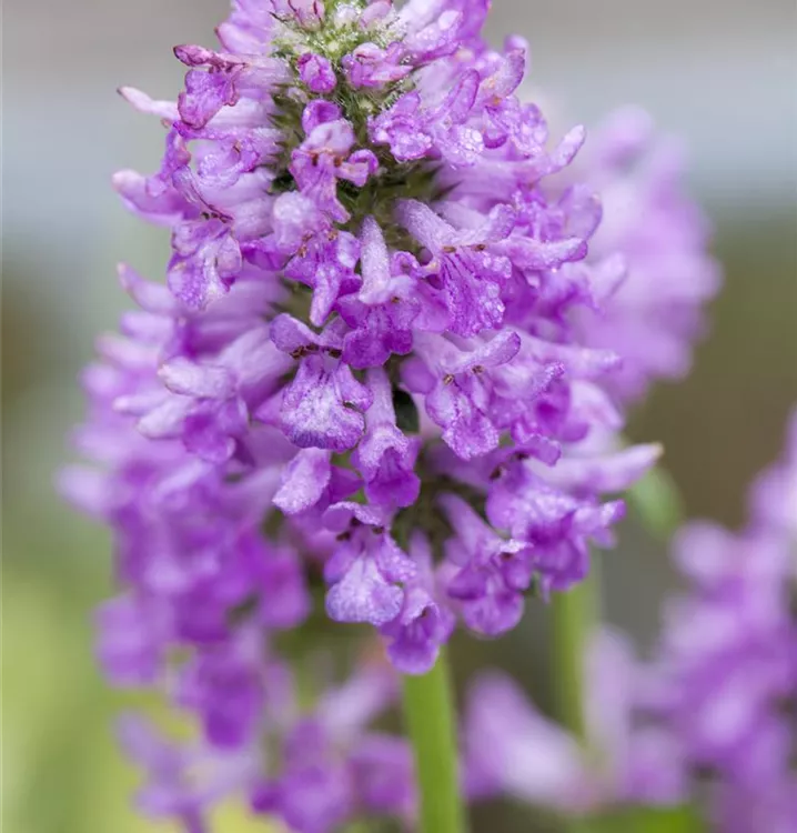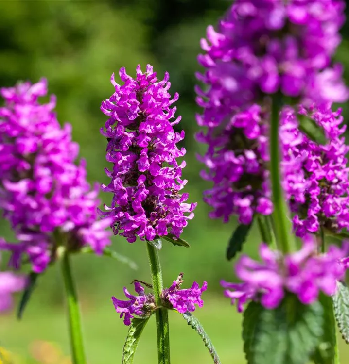 Stachys monnieri 'Hummelo' bildet lippenförmige, in Quirle angeordnete, dunkelrosafarbene Blüten ab Juni.