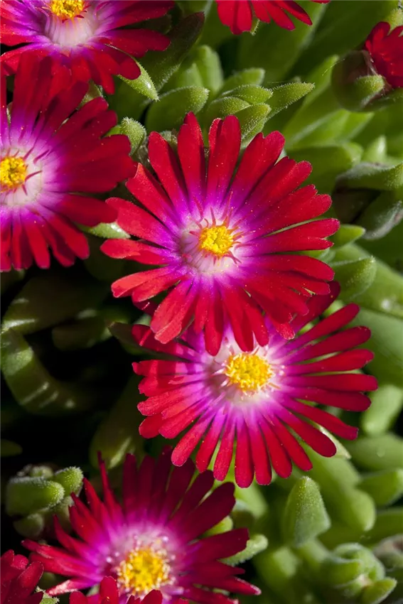 Delosperma cooperi Jewel of Desert 'Garnet' Die dickfleischigen, immergrünen Blätter der Delosperma sind saftig grün. Vertreter wie die Mittagsblumen zeichnen sich zudem durch einen niedrigen Wuchs und ihre teppichartige Ausbreitung aus. Bei einer maximalen Höhe von unter zehn Zentimetern, sind sie ideal als Bodendecker geeignet. Neben ihren Wuchseigenschaften sind jedoch auch die wunderschönen, auffälligen Blüten der kleinen Exoten nennenswert. Egal, ob die gelben, röhrenförmigen Blüten der Mittagsblumen oder die körbchenartigen, unterschiedlich farbigen Blüten der Winterharten Eisblumen dem eigenen Geschmack mehr entsprechen – jede dieser Pflanzen bietet unzählige Gestaltungsmöglichkeiten für den eigenen Steingarten. Dabei zeigen sich die sukkulenten, also dickfleischigen, Pflanzen äußerst anspruchslos: Ein sonniger Standort und ein trockener, durchnässter Boden genügt, damit die aus Afrika stammenden Pflanzen prächtig gedeihen. Unter diesen Standortbedingungen erfordern die Stauden kaum Pflege und müssen lediglich vor Stau- und Winternässe geschützt werden. Im Zweifelsfall kann eine einfache Drainage (also eine Entwässerungsanlage) sicherstellen, dass die wunderschönen Exoten keine nassen Füße bekommen.